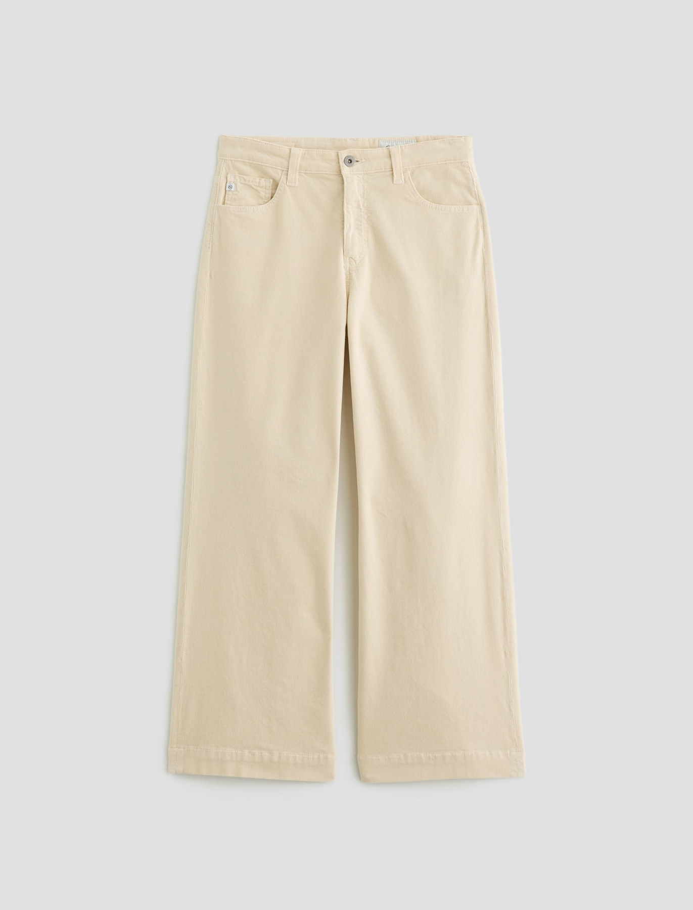 The Saige Wide Leg Crop is an off-white mid-rise jean with loose, cropped legs and raw hems. These women's wide-leg jeans come in our 8.7 oz. Hyper Soft Bull Denim featuring dual-elastic for supreme comfort and advanced recovery. AG Cloud Soft Denim™ fabrics feature special left-hand twill construction that allows the yarns to gently relax and untwist for a luxe, supple feel. It's designed to get even softer the more you wear it.